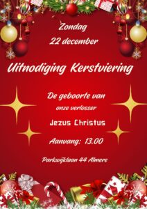 We gaan op 22 december de geboorte van Jezus Christus onze redder en verlosser vieren. U bent van harte uitgenodigd om dit bij te wonen. Neem gerust familie en vrienden mee. Na afloop eten we samen en is er tijd voor een gesprek.