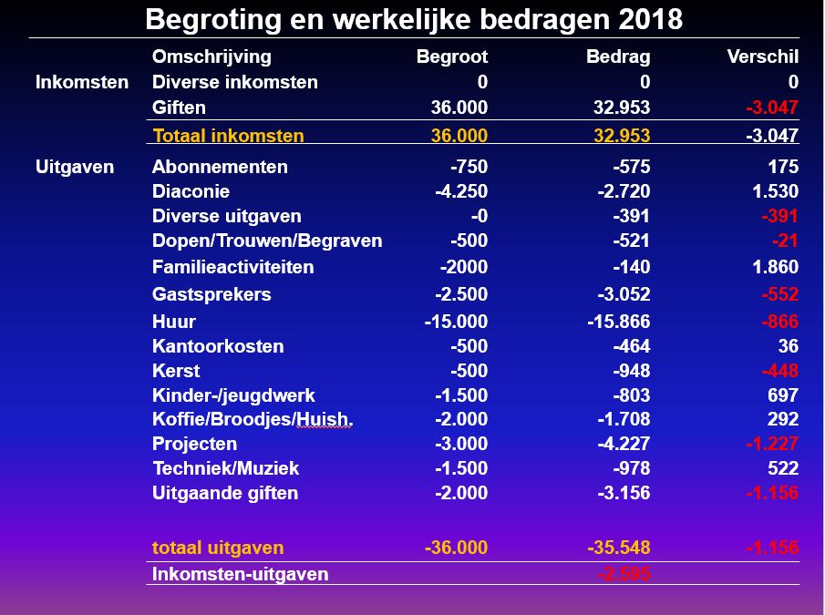 In het overzicht zien we de bedragen die begroot zijn en in de kolom daarnaast het bedrag wat werkelijk binnen gekomen is of uitgegeven is. De laatste kolom geeft het verschil aan tussen het bedrag dat begroot is en de werkelijke bedragen .